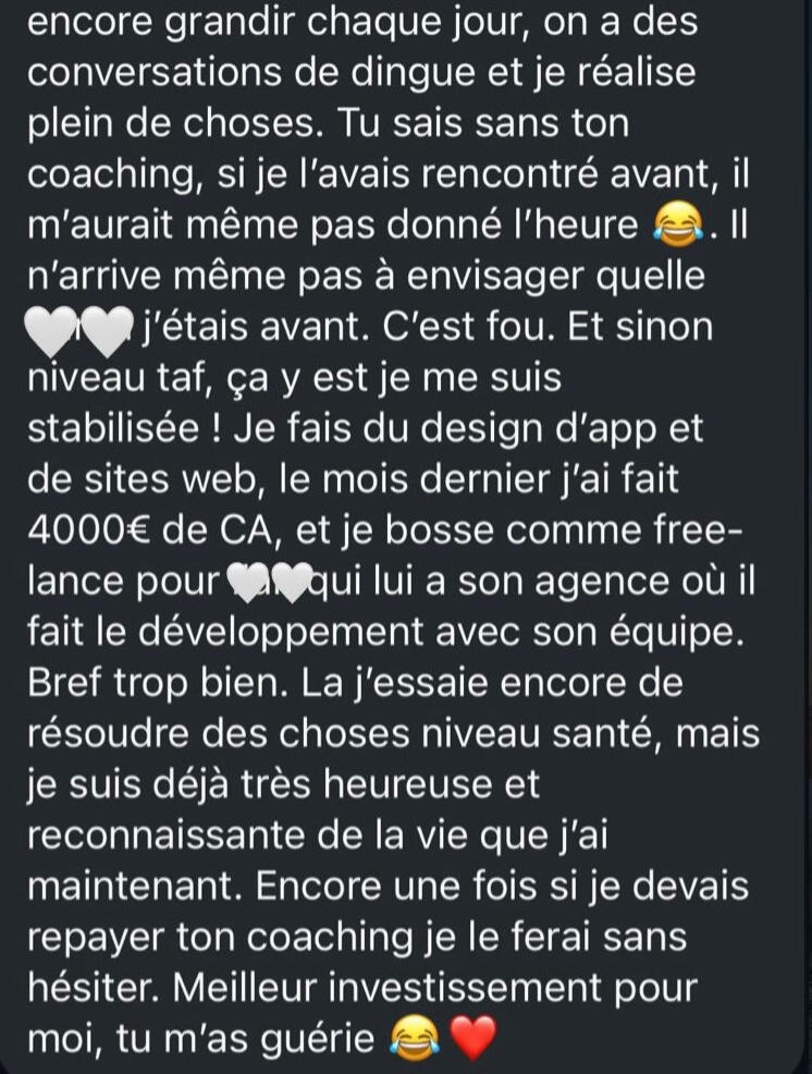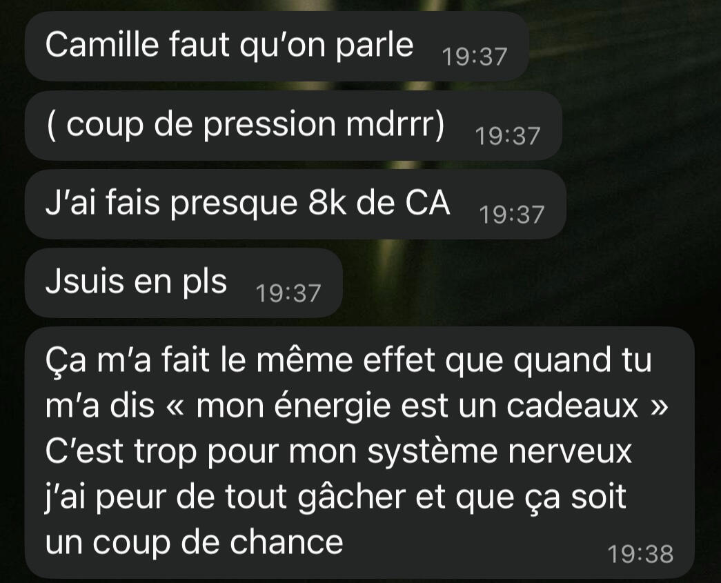 Si je comprends ce que tu vis aussi précisément, c'est parce que moi aussi, j'ai été cette femme.Pendant des années, j'ai encaissé. J'ai avancé. J'ai performé. J'avais développé une armure de sur-contrôle et de sur-responsabilité pour survivre. Et un jour, le corps et l'âme ont dit stop.Mon business oscillait lui aussi. Je travaillais énormément, je me dispersais, je doutais de tout. Burn-out, instabilité financière, effondrement identitaire. J'ai tout traversé.Et c'est en creusant vraiment — l'identité, le système nerveux, les blocages émotionnels, la spiritualité incarnée — que tout a changé. Pas en faisant plus. En faisant juste.